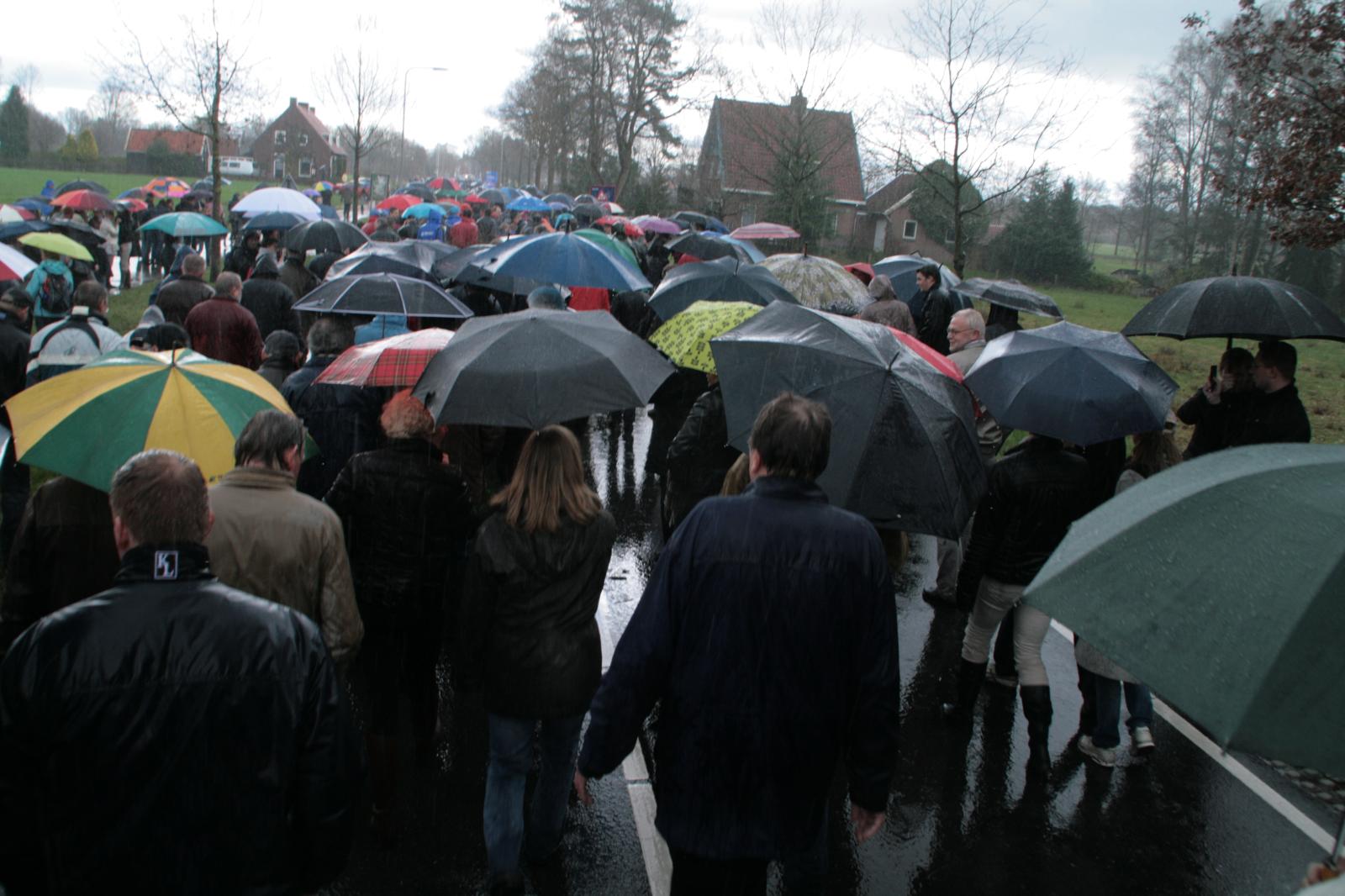 In stromende regen op weg naar het doarp